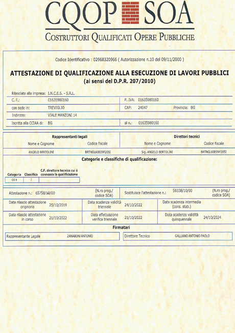 La nostra Societa' inoltre, e' in possesso dell'Attestazione di qualificazione alla esecuzione di lavori pubblici SOA.